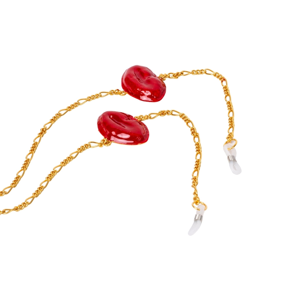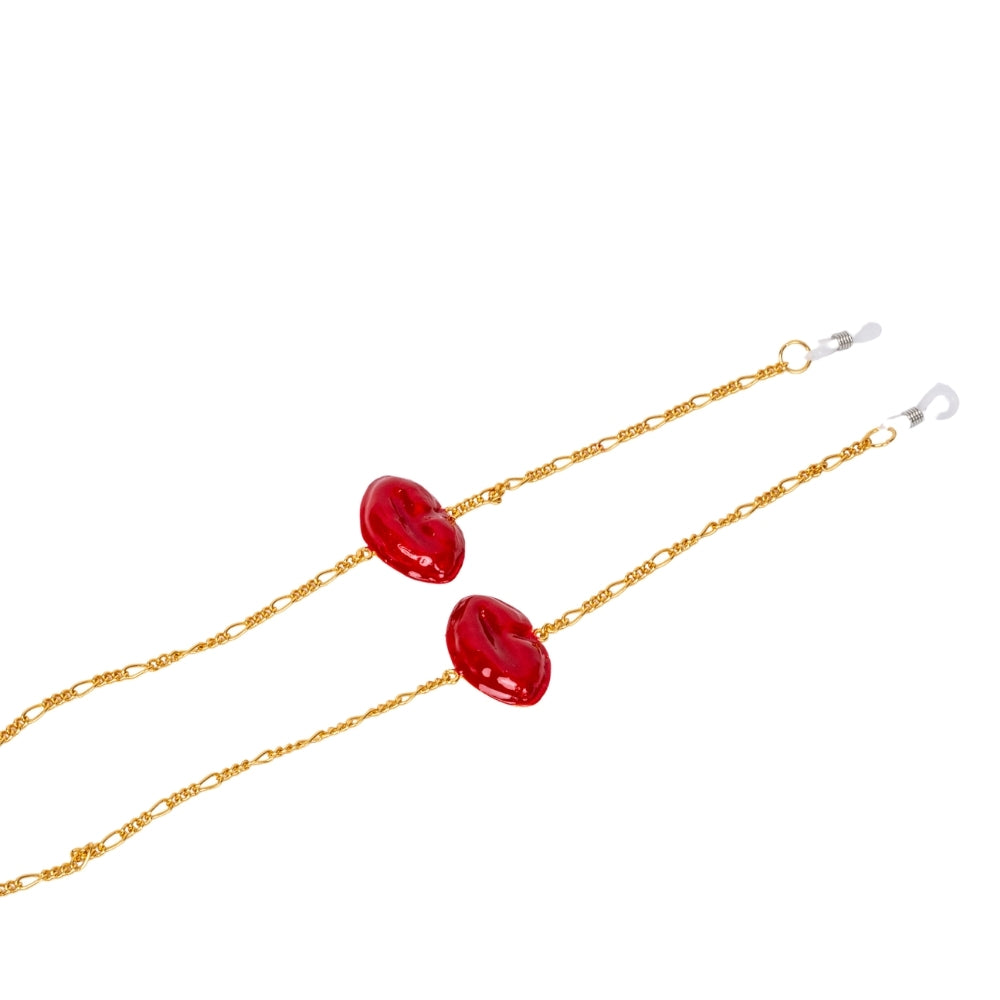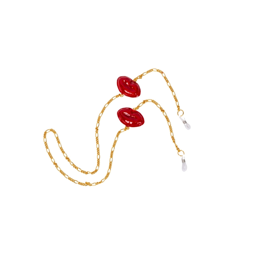 El holder Mil besos lleva dos labios rojos intensos que se unen en una delicada cadena con baño en oro de 24k , para que tus gafas nunca se pierdan y siempre luzcan con un toque coqueto.
