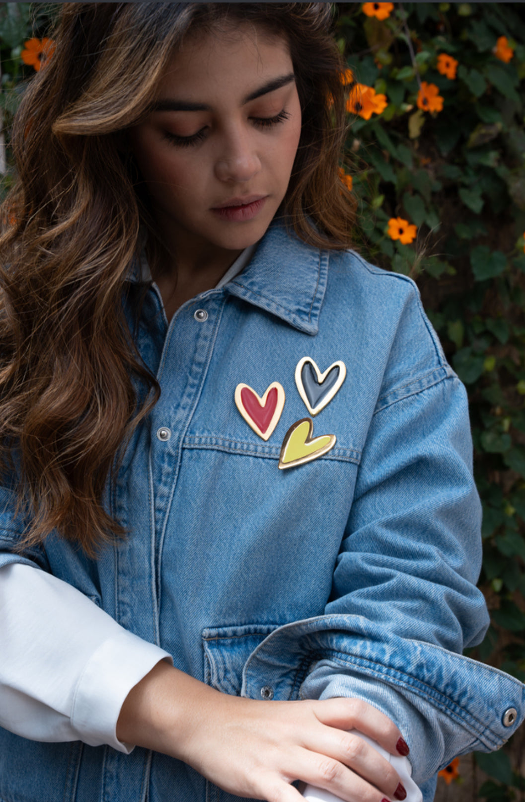 Prendedor en bronce con baño en oro de 24k y esmaltado en colores vibrantes. Amor Mío es un corazón coqueto y colorido que se lleva cerquita del alma… y del outfit.