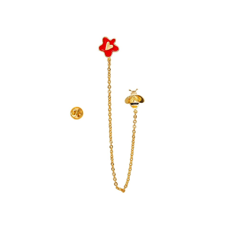 Prendedor en bronce con baño en oro de 24k. Bee You: Dulce Encuentro une una flor esmaltada y una abejita dorada a través de una cadenita que las mantiene juntas. Un gesto tierno, vibrante y lleno de intención.