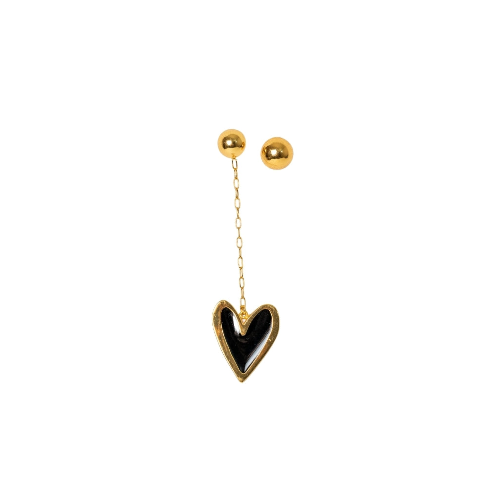 Asimétrico, romántico y con actitud. El Solitario Amor Mío es un juego de contrastes: un arete largo con un corazón que se balancea como un suspiro y un topo discreto que lo acompaña. Elaborados en bronce con baño en oro de 24k.